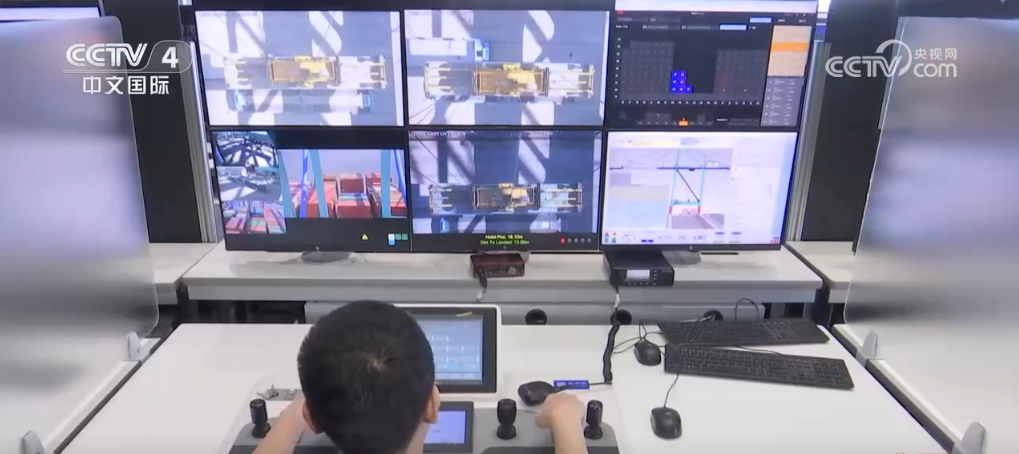 “现代哥本哈根”轮停靠的天津港是中国最大、世界等级最高的人工深水港。货轮停靠后,集装箱首先会由船边的岸桥逐一抓起,移动到地面的运输车上,再送到堆场等待查验。而第一步也就是岸桥的装卸作业就集中使用了AI、大模型和F5G全光工业网这些新技术,把岸桥驾驶室搬进了600多米外的智控中心,在这里操作员只要轻轻移动操控杆就能远程作业。