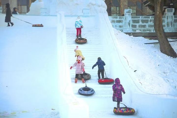 当然最抢手的 还属冰雪滑梯 其实冰雪大世界的网红滑梯虽然长 但如果你想体验 “24小时随时可滑” 小编还是建议自己准备一个 雪圈或者简易雪板 因为松花江两岸和市区的公园里 有各种免费的滑道 甚至一些野坡 也成为享受冰雪运动的好去处