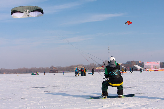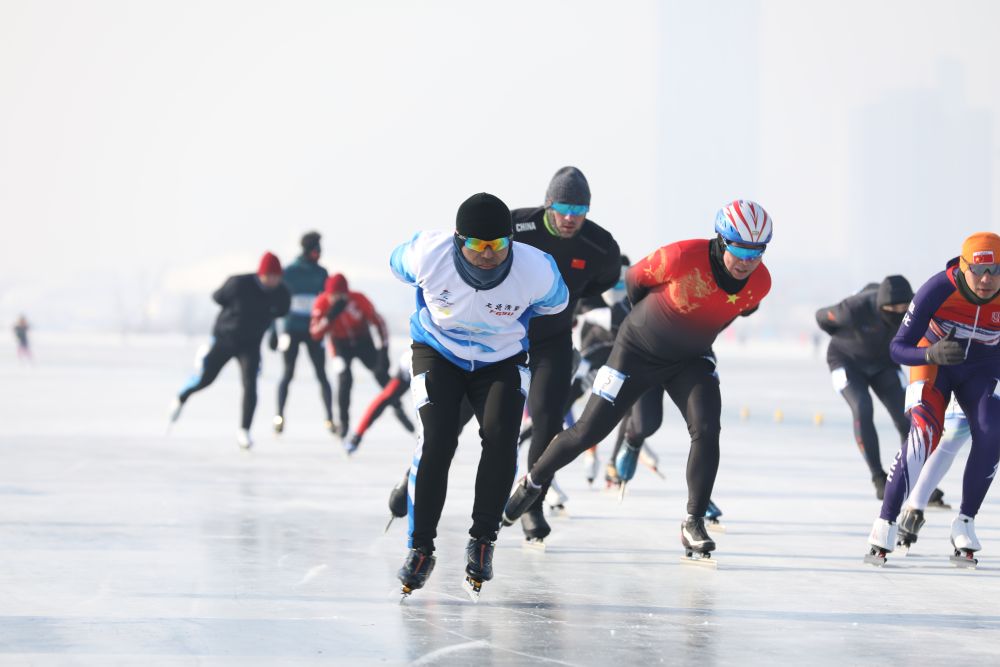 如果嫌冰坑太小 那可以玩把大的 马拉松见过吧 速滑马拉松见过吗 在松花江上的速滑马拉松见过吗 在哈尔滨大剧院旁的江面上 寒风凛冽 发令枪响 数百名身着速滑服装的滑冰爱好者 冲出起点向着远处滑行 不一会就看不到选手的身影了 只见白雪覆盖的江面上 一个个小点在快速移动