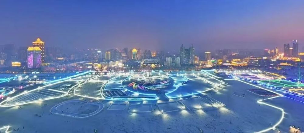 和往年不同 今年冰封的松花江上的冰雪娱乐园区 可谓一眼望不到头 这句话一点不夸张 因为从道外区到道里区的江边 十几公里的长度 分布着各种冰雪娱乐场地