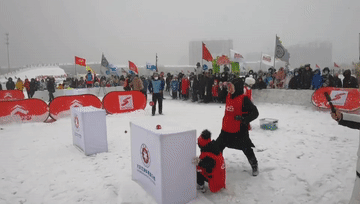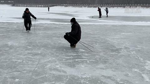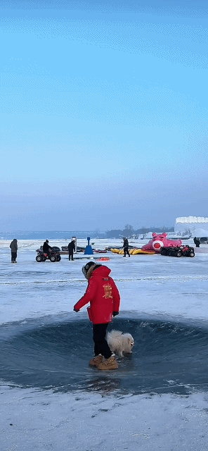 这不 天生就带“防摔倒系统” 当然 不会摔倒不算一项运动 但自己给自己挖个坑 这项运动就有点抽象了 松花江上冻到数米厚的冰层 用工具挖出一个冰坑 玩的就是 自己挖的坑 自己跳 话说 哈尔滨这种游玩的冰坑还挺多 大家没事可以去找找