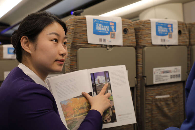 乘务员殷绎茹化身导游,在为旅客介绍当地风景特色,满足旅客多样化需求。张明华/摄