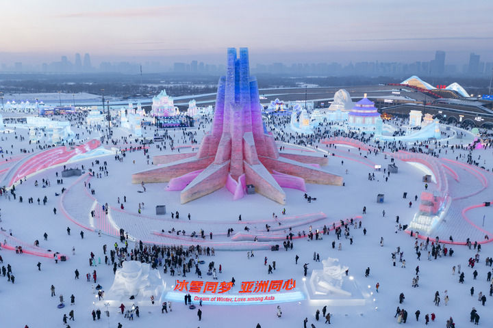 ??2025年1月5日,在哈尔滨冰雪大世界园区,游客在主塔“亚洲同心”附近游玩(无人机照片)。新华社记者 谢剑飞 摄