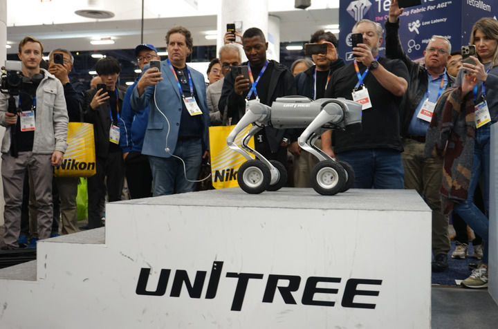 ??2025年1月8日,在2025年美国拉斯维加斯消费电子展(CES)上,人们在中国企业宇树科技的展区观看机器狗展示。新华社发(曾慧摄)