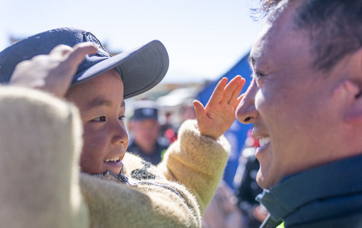 ??2025年1月14日,在西藏定日县长所乡嘎布村,一个孩子戴上移民管理警察米玛次仁的帽子敬礼。新华社记者 丁增尼达 摄