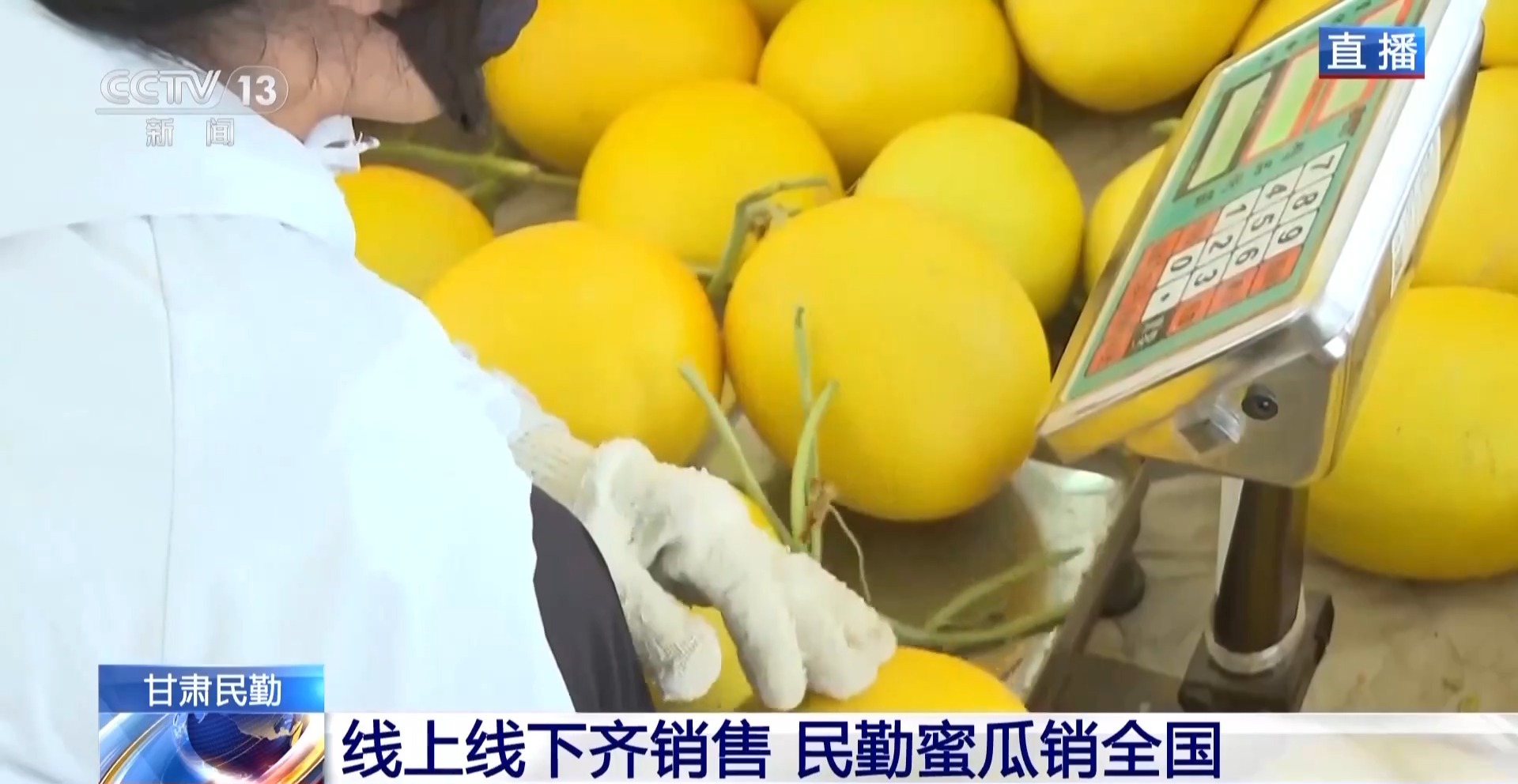 总台记者 马丽:借助蜜瓜产业,当地也衍生出了专业验瓜人、物流工人、网络主播等多种职业。每年蜜瓜成熟季,外地客商来到民勤,也带动了本地的餐饮、住宿和其他消费。今年,民勤全县的蜜瓜种植面积达16万余亩,预计总产量51万吨。可以说,蜜瓜产业现在已成为本地百姓增收致富的一项支柱产业,“甜蜜”经济也让大家的日子越过越好。