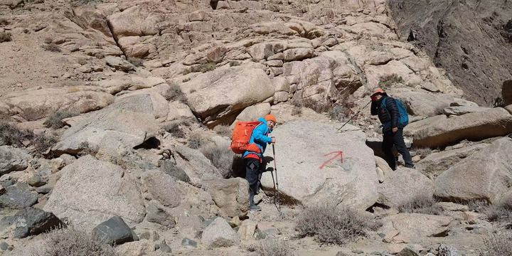 为验证猜想,田才让和邓李才团队决定爬上赛什腾山一探究竟。陡峭的山体、风化易碎的坡面不仅难以攀爬,而且方向难辨。他们背着自喷漆反复勘探,标记出了一条上山路线。