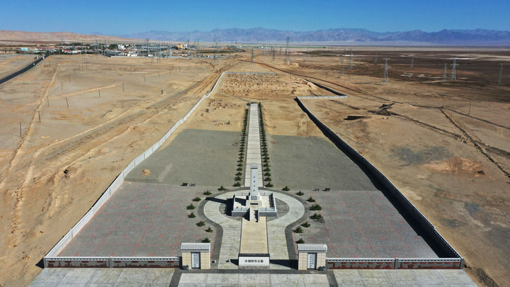 在冷湖镇东南方向,一座高耸的纪念碑引人注目。这里是冷湖四号公墓,长眠着自青海油田开发以来,因公、因病去世的400多位油田职工及家属。他们把“爱国、创业、奉献、实干”镌刻在丰碑之上。