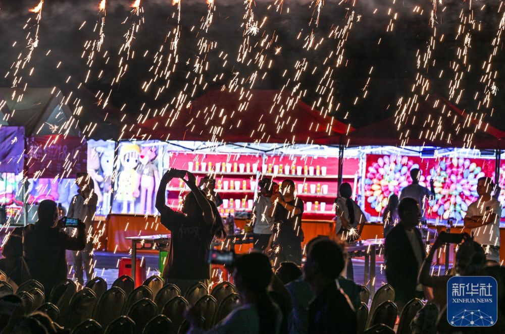 ↑ 10月5日晚,游客在贵州省晴隆县阿妹戚托小镇观看焰火表演。新华社记者 杨文斌 摄