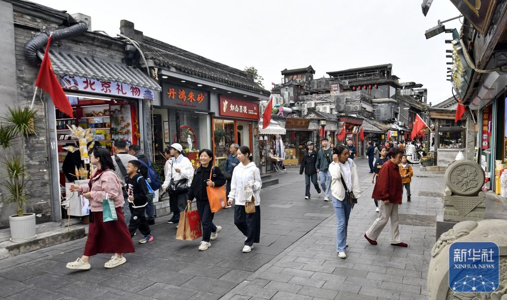 ↑ 10月6日,游客在北京烟袋斜街游览。新华社记者 李欣 摄