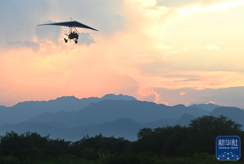 ↑ 10月6日,游客在浙江省金华市武义县大斗山飞行营地乘坐动力三角翼。新华社发(张建成摄)