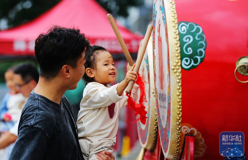 ↑ 10月6日,在山东省滕州汉画像石馆门外,家长陪着孩子体验击鼓。新华社发(李志军摄)