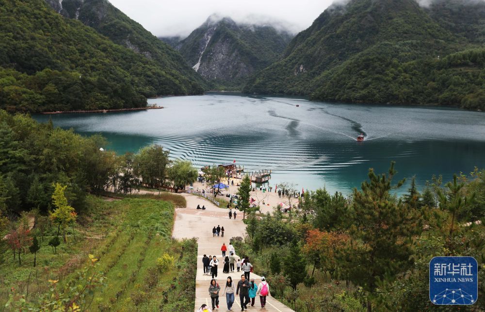 ↑ 10月6日,游客在甘肃省陇南市文县境内的天池景区游玩。新华社发(王克贤摄)