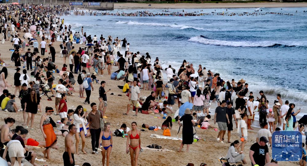 ↑ 10月6日,在海南省三亚市大东海景区,市民和游客在海滩戏水。新华社记者 赵颖全 摄