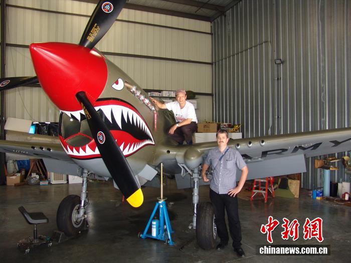 卢百可(右一)与广西柳州媒体人黄希翎(右二)在美国一收藏家家里与飞虎队P-40战机合影。 受访者供图