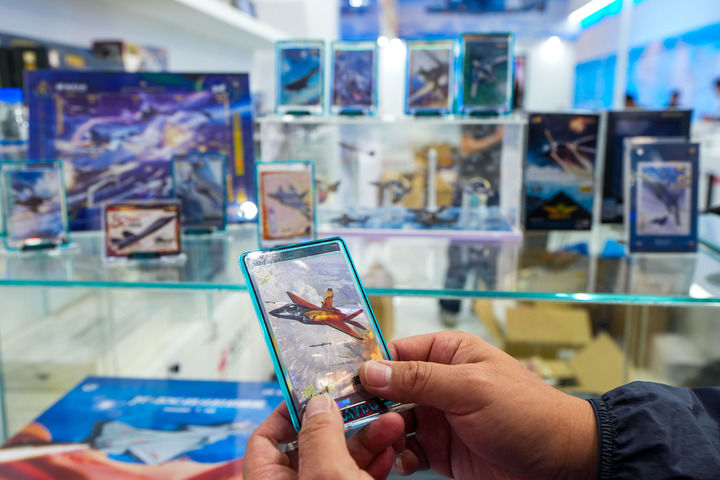 ??9月19日至23日,2025年长春航空展在长春国际航空博览城举办,吸引诸多参观者观展。图为一位参观者在展会现场选购航空文创产品卡游致胜空天中国战机卡牌。新华社记者 许畅 摄