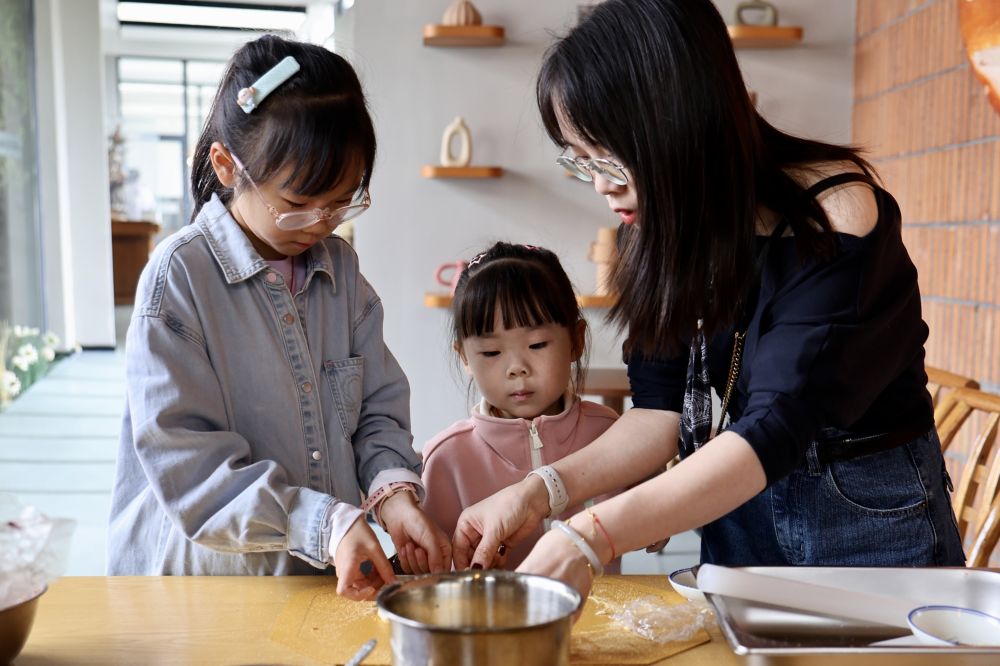 2025年10月3日,小朋友在安徽省合肥市庐江县万山镇一家窑炉面包店内体验面点制作。新华社发(凤俊 摄)