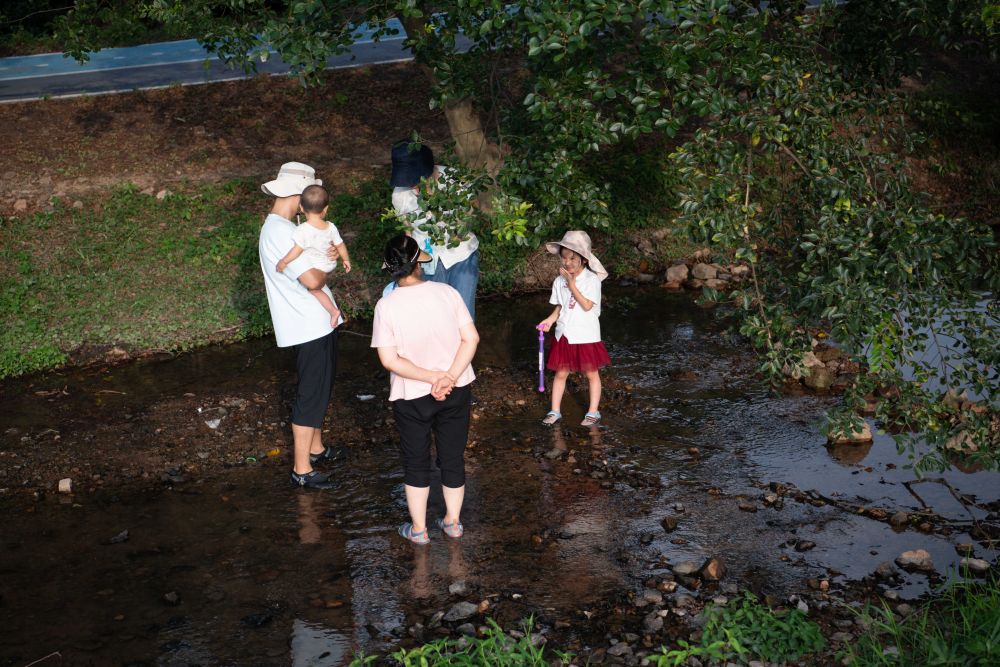 2025年7月26日,游客在安徽省合肥市庐江县长冲村的小溪里戏水。新华社记者 张端 摄