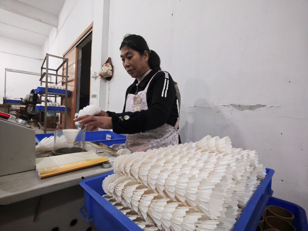 在兴龙体育用品有限公司的生产车间,一片片羽毛经过分选、定型、装配等多道工序,被加工成品质稳定的羽毛球,发往世界各地。“印尼、马来西亚、泰国等是我们的重点市场,每年出口量占到总产量的三成左右。”李星星说。