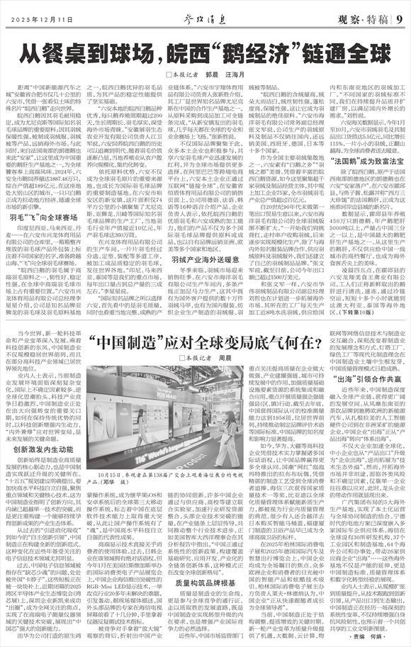 目前,在六安市羽绒及制品企业中,有国家级专精特新“小巨人”企业1家、省级专精特新企业5家,12家企业与高校共建研发平台,攻克17项行业关键技术,拥有专利130余项。在“含绒量”的光环之外,“科技量”正成为皖西白鹅产业的新标签。
