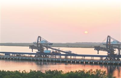 几内亚西芒杜马瑞巴亚港口,落日余晖下,装船机在水面映出剪影。