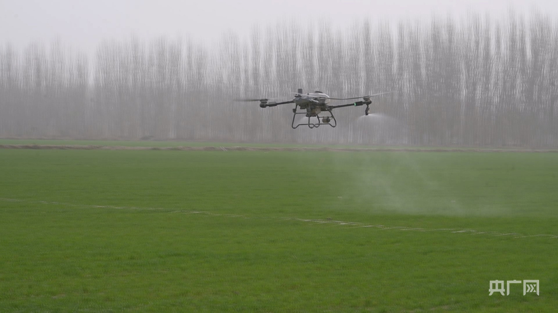 植保无人机正在阿克苏市麦田上空开展飞防作业 (央广网发 热普亥提・阿不力米提 摄)