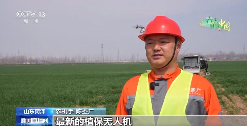 农机手 陈丕广:我今年又新置了五台最新的植保无人机。这个无人机能载重一百一十公斤,喷雾效果好,喷得均匀,作业效率比之前无人机能提高百分之二十左右。只要是不间断作业的话,一台机器一天能喷将近两千亩地左右。