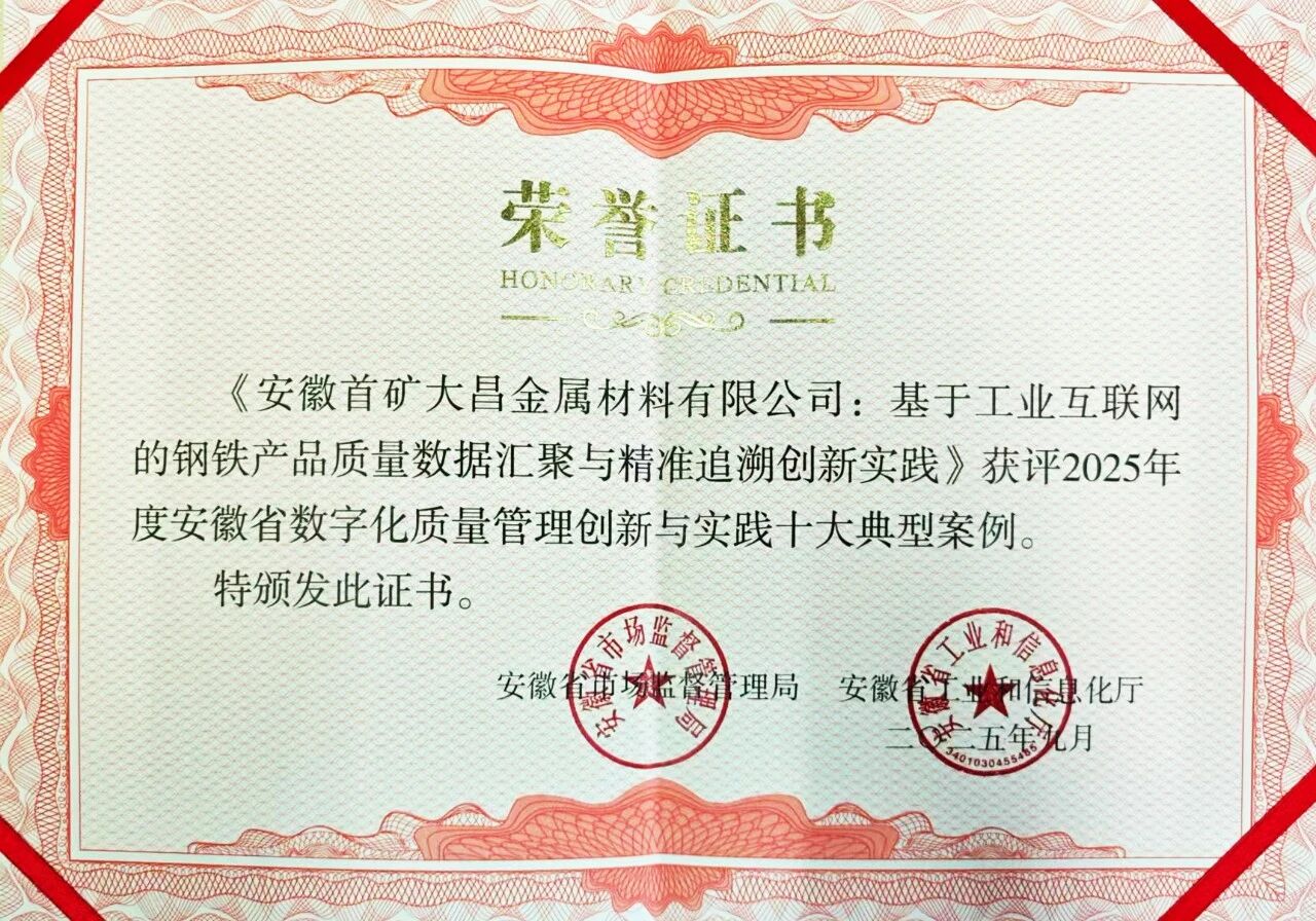 9月13日,安徽省市场监管管理局、安徽省工业和信息化厅发布“2025年安徽省数字化质量管理创新与实践十大典型案例”。仪式上,安徽省副省长任清华出席并宣布活动启动。省知识产权、质量和标准化管理委员会副主任、省市场监管局党组书记、局长潘东旭出席并致辞。六钢集团旗下安徽首矿大昌金属材料有限公司申报的《基于工业互联网的钢铁产品质量数据汇聚与精准追溯创新实践》成功入选“2025年度安徽省数字化质量管理创新与实践十大典型案例”。