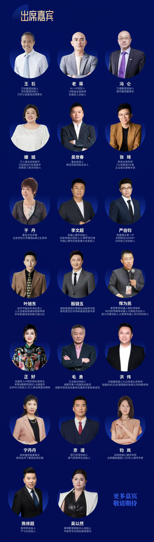 次日议程聚焦于实战方法论与内在建设。万人峰会总操盘手媛姐将用整个上午系统分享《个人IP持续变现方法论》,拆解从0到1再到N的完整商业闭环。下午,著名文化学者、北京师范大学教授于丹将主讲《AI时代下如何用传统文化重启商业心力》,为科技驱动的商业世界注入深厚的文化定力。随后,AI头部IP严伯钧将解读《AI时代的机遇与变革》。晚间,前字节跳动市场负责人叶旭东则带来《AI+IP助力“一天变现,年增千万”》的高效转化模型。