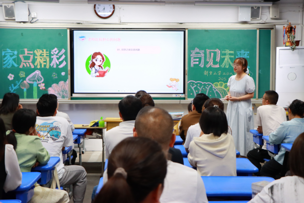 家长会由学校集中授课和班级授课两部分组成。在集中授课环节,校长凌黎向家长们介绍“小松”校园文化,宣传义务教育优质均衡创建工作,并对家庭教育进行指导。家长们认真聆听,通过图片感受孩子们丰富的校园生活。