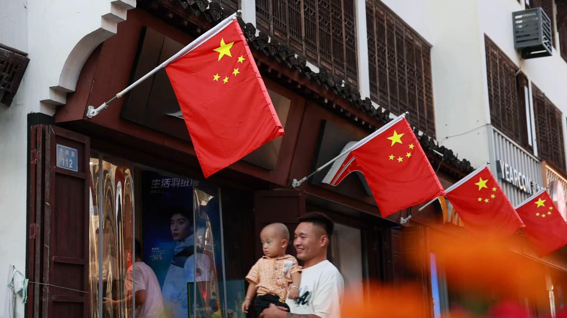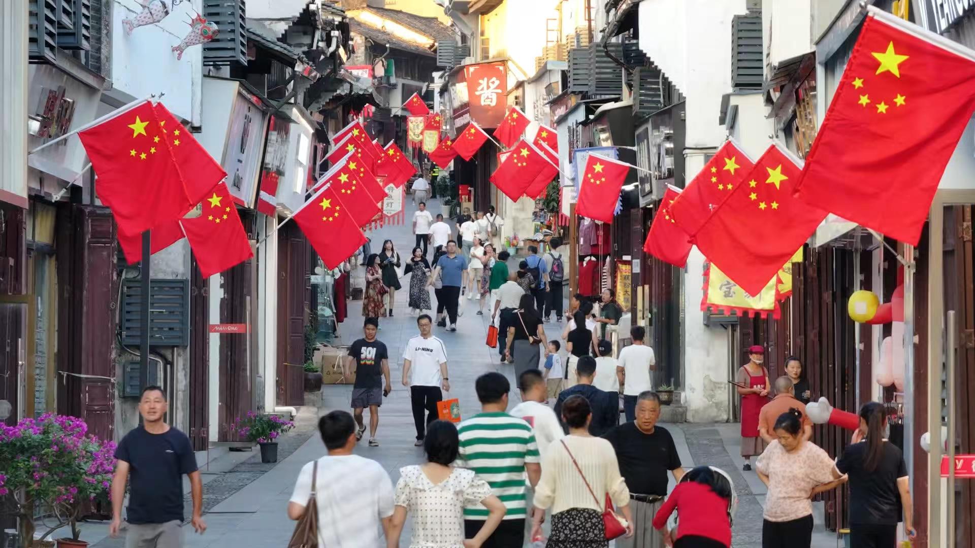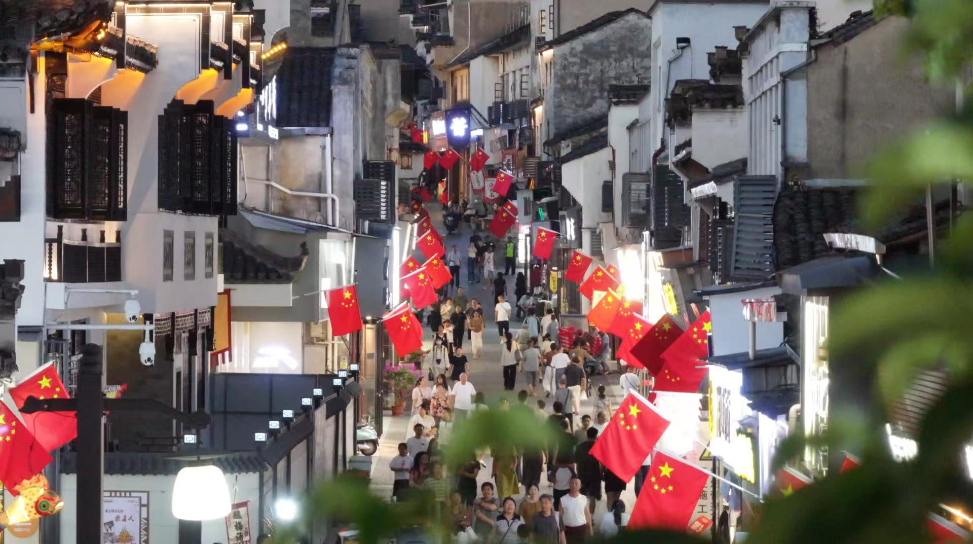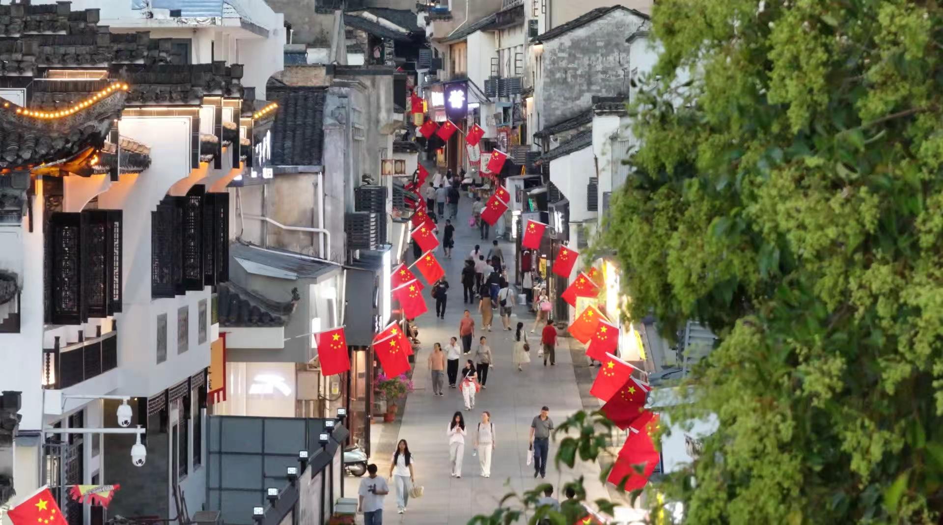 走进徽州古城,一面面鲜艳的五星红旗沿着街巷依次铺开,从商铺门楣延伸至青石板路尽头,将古朴的街巷装扮成红色的海洋。