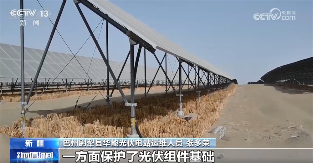 巴州尉犁县华能光伏电站运维人员张多荣称:“大概两个月时间就能抽穗发芽了,一方面保护了光伏组件基础不被黄沙掩埋或掏空,另一方面改善了周围环境。”