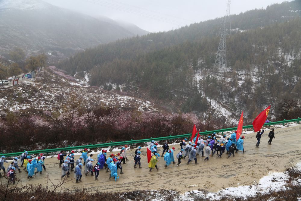 2021年,固原二中和弘文中学师生经历了迄今为止最艰难的一次徒步:一路上雨雪交加,很多学生的鞋子被雨水泡湿,不时陷入泥潭,相互协助才能拔出;有些路段处处泥水坑,只能一步一步趟水前行,鞋子不时“呲呲”发声;回程时由于下山道路实在泥泞难行,不得不临时改变线路,沿着山顶返回,拉长路途……