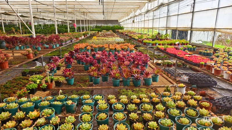 一盆盆色彩斑斓的多肉植物,分门别类地摆放在大棚里(央广网记者 郝振青 摄)