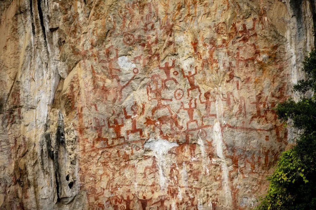 刻在左江流域绝壁之上的 花山岩画 2016年入选世界文化遗产 其笔画古朴粗犷,人物形态各异 甚至出现了壮族大铜鼓的图案 两千多年前的人们玩涂鸦 一出手就是惊世之作