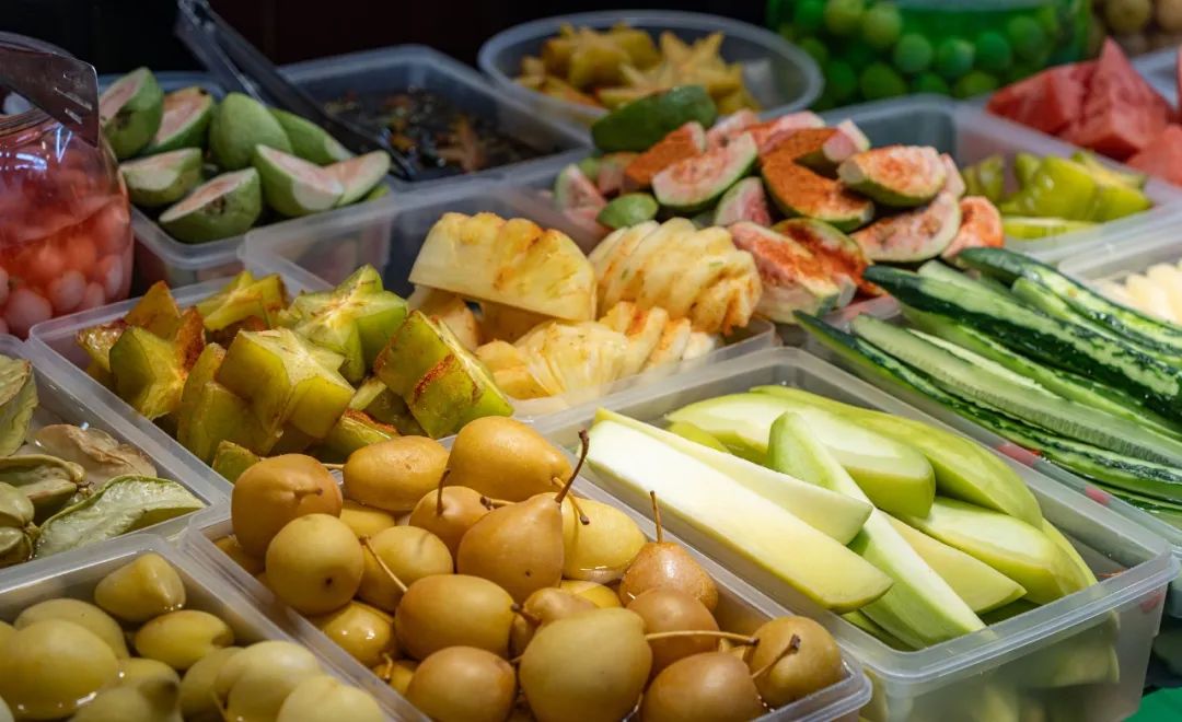 当广西水果遇上广西风味 经过清洗、整理、调味、腌渍 等待发酵,腌出酸嘢 街边就有了大大小小的酸嘢摊 青芒脆李蘸椒盐 汇成了酸辣咸甜大交响