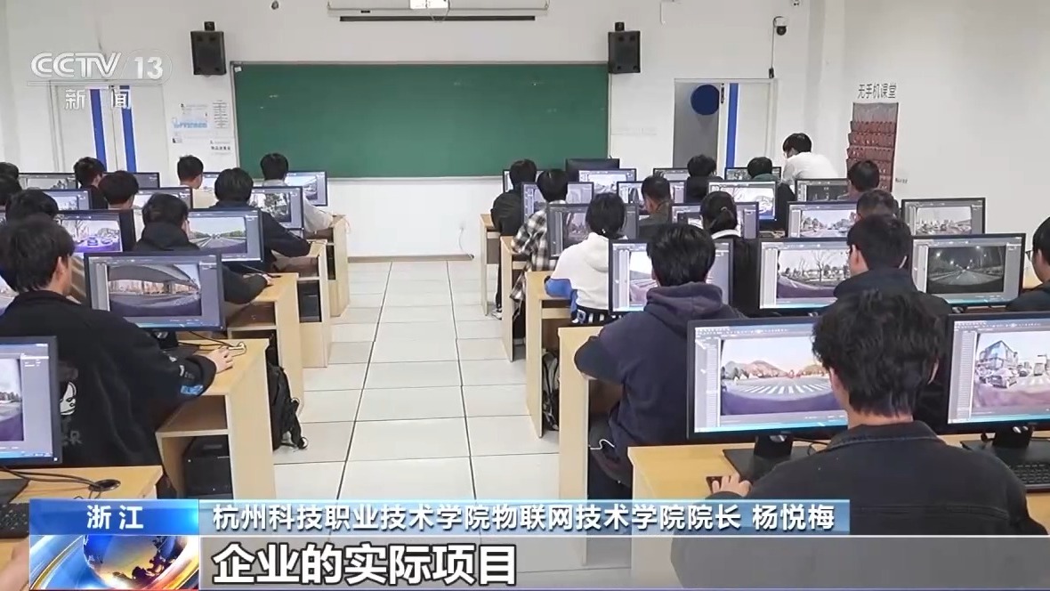 杭州科技职业技术学院物联网技术学院院长 杨悦梅:我们跟企业共建了人工智能开发的课程。在企业岗位脱产锻炼过的老师,跟企业导师共同来进行课程教学,学生在课堂上做企业的实际项目。