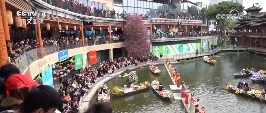 南宁民歌湖的民歌广场是2025年广西“三月三”的主会场。在水上主舞台表演的是来自全国各地“四季村歌”歌队的十几个代表队。2025年的广西“三月三”主会场还有很多有意思的设置。比如,“有得花”鲜花市集、“有得耍”科技潮玩市集、“有得吃”东南亚风情水上市集等。