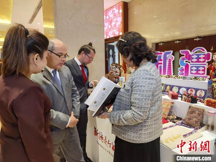 3月31日,新疆在北京举办有关国家驻华使节交流会,来自43个国家和国际组织的70位外宾出席。图为外宾在新疆特色产品展区参观。 中新社记者 徐雪莹 摄