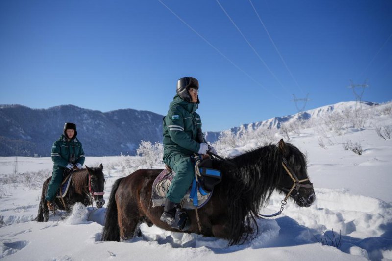 禾木110千伏输电线路巡线工人闫向红、马铭在骑马巡线。新华社记者徐宏岩 摄
