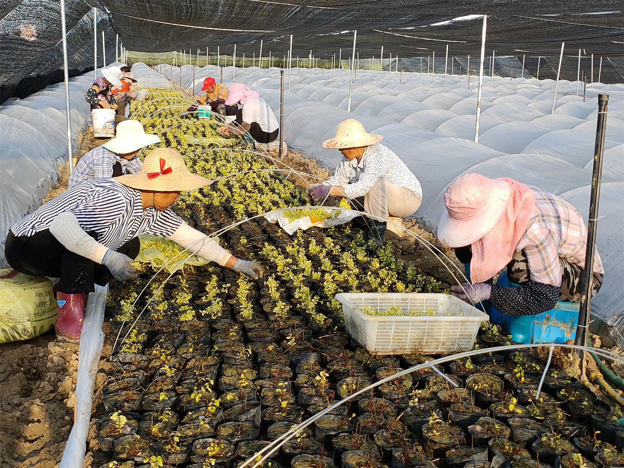 8月6日清晨,明光市香花涧特色花卉苗木产业园里一派忙绿的景象,明南街道大辛村村民们有的在遮阳棚内移栽亮晶女贞色块苗,有的在浇水进行管护,有的在石楠田块中拔草。跃龙新材料公司经理秦先胜、大辛村党总支书记蔡润等人穿行在花卉基地查看栀子花、女贞、石楠等花卉长势。