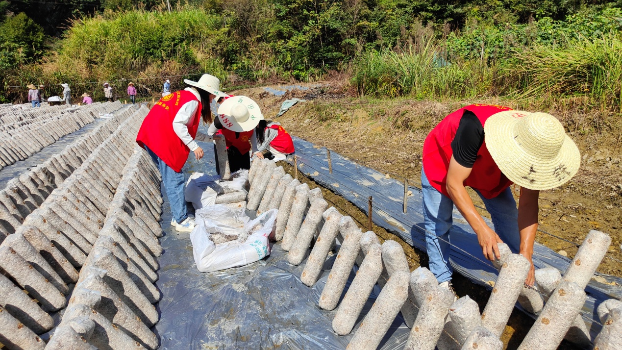 基地田亩间,志愿者们分工协作,相互配合,累得汗流浃背,却始终干劲十足。随着志愿者们不断穿梭的身影,原本空荡荡的基地逐渐被一串串银灰色的菌棒铺满,一抹抹“志愿红”描绘出一幅靓丽的乡村田间助农图,传递着新时代文明实践的温暖。