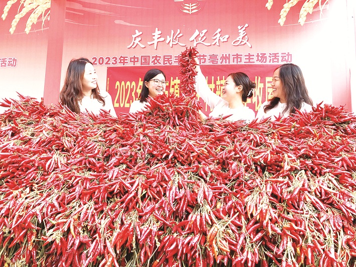 本网讯 金秋九月,大片火红火红的辣椒把谯城装扮得异常美丽。9月23日,位于亳州市谯城区芦庙镇王楼村的皖北朝天椒特色农产品贸易中心宣布正式开业,当天,2023年中国农民丰收节亳州市主场活动也在这里隆重举行,可谓双喜临门。