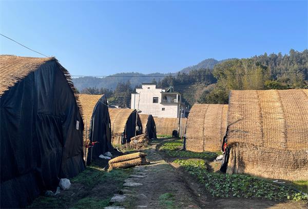 近日,强冷空气南下,气温持续走低,而在休宁县流口镇流口村的羊肚菌种植基地,却是一番热火朝天的景象。新年伊始,基地的16座钢架大棚披上了一层厚厚的“稻草衣”,仿佛穿上一件件朴素而温暖的“新年新衣”。走进棚内,湿润的土壤中密密麻麻的菌丝正悄然舒展,已形成原基。