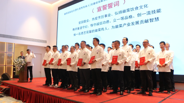 在“名师带徒”环节,张根东为新一批工作室成员(徒弟)颁发证书,并殷切寄语:坚守传统之本,勇开创新之路,真正肩负起徽菜非遗传承人的责任与使命。