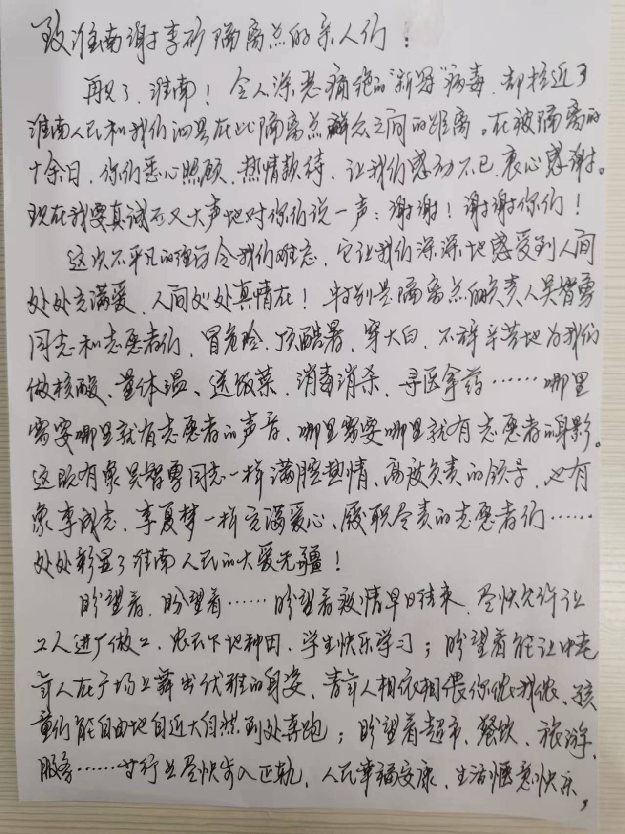 “这次不平凡的经历令我们难忘,它让我们深深地感受到人间处处充满爱,人间处处真情在!特别是隔离点的负责人吴智勇同志和志愿者们,冒危险、顶酷暑、穿‘大白’,不辞辛苦地为我们做核酸、量体温、送饭菜、消毒消杀、寻医拿药……”