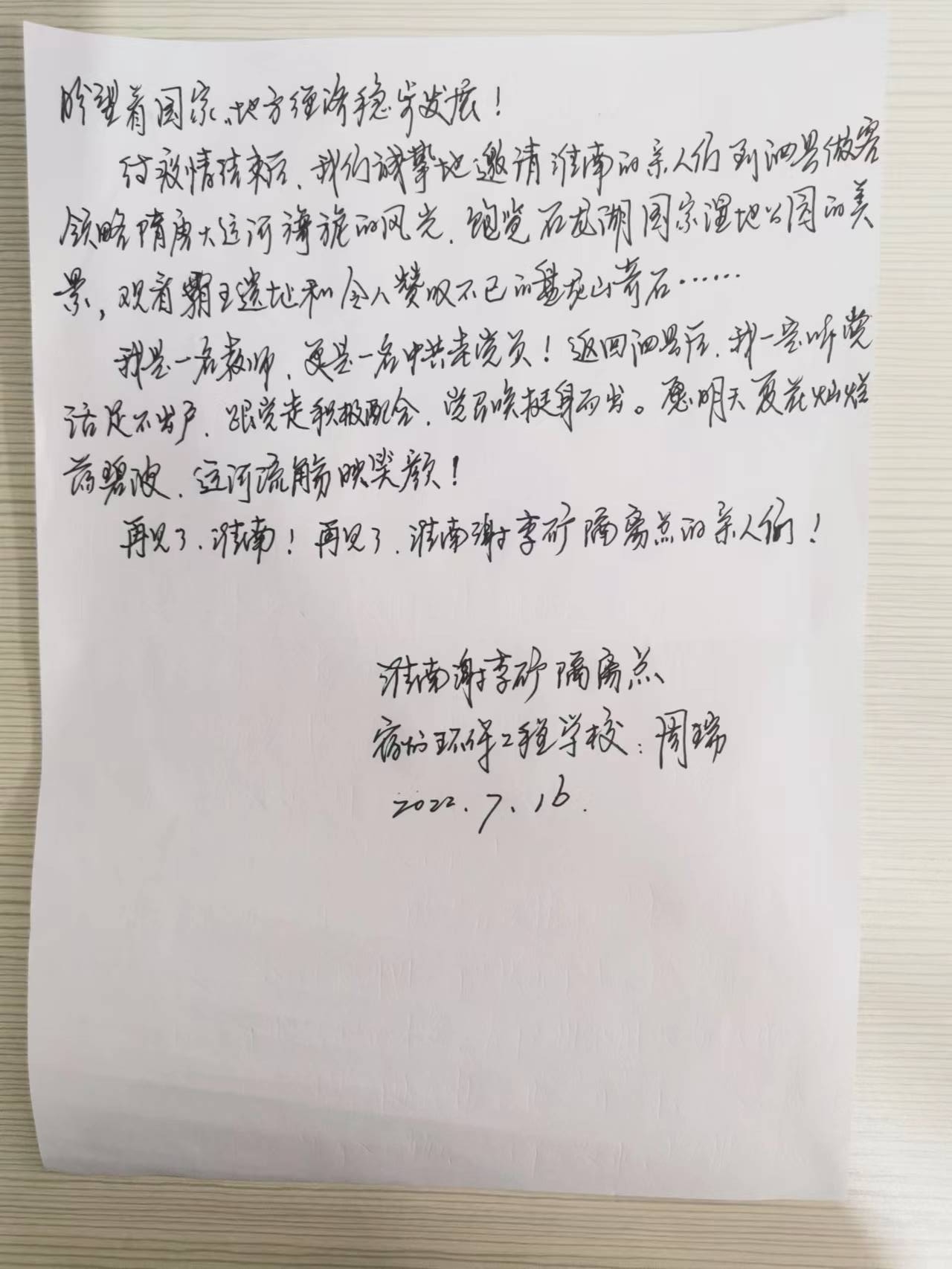 (图为该隔离点的隔离人员、宿州环保工程学校教师周瑞的感谢信)