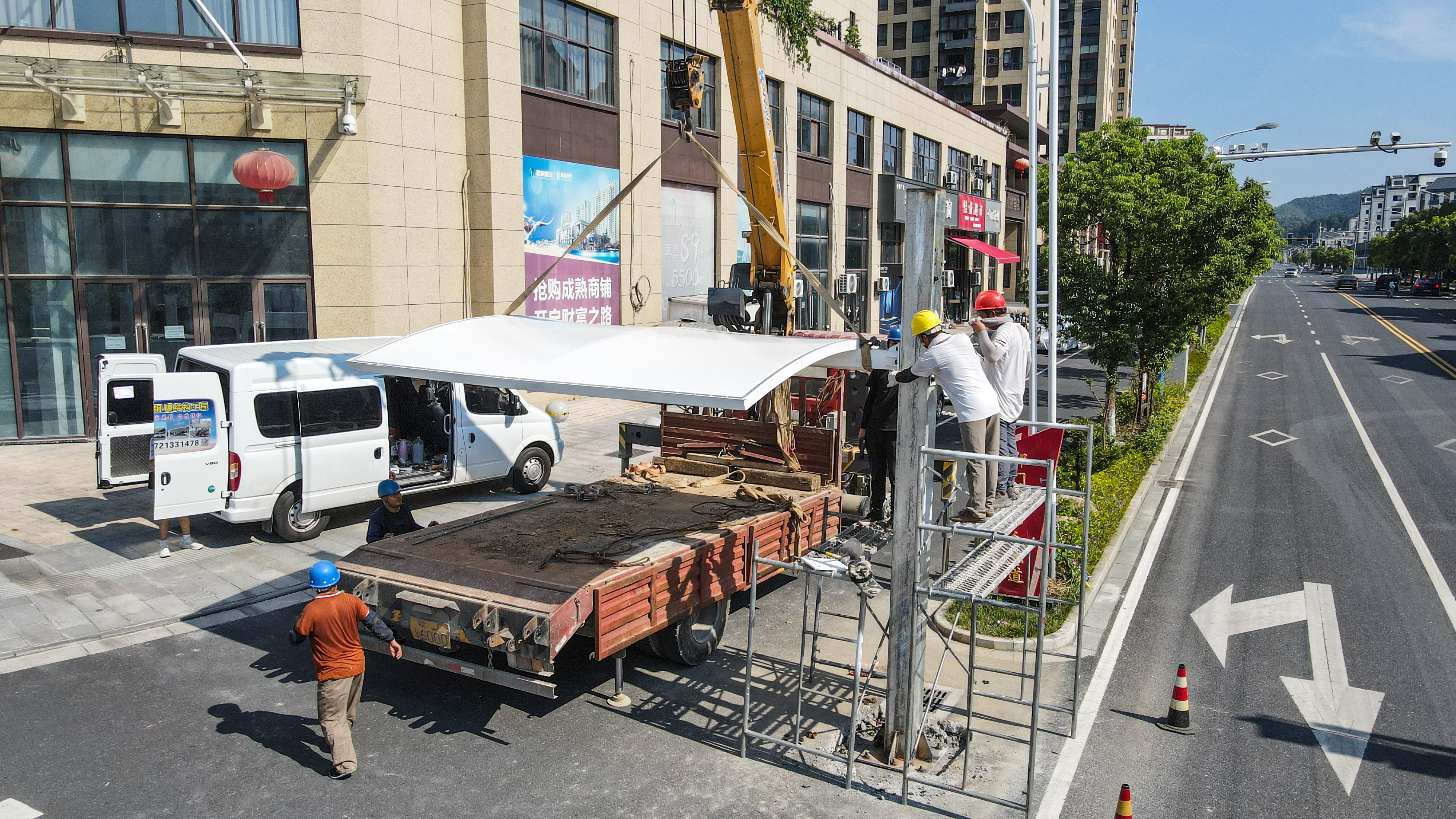 连日来,在祁门县新城区各主要交通路口,搭建遮阳雨棚的工作正在紧锣密鼓进行中,部分路口的遮阳雨棚已陆续“上岗”。