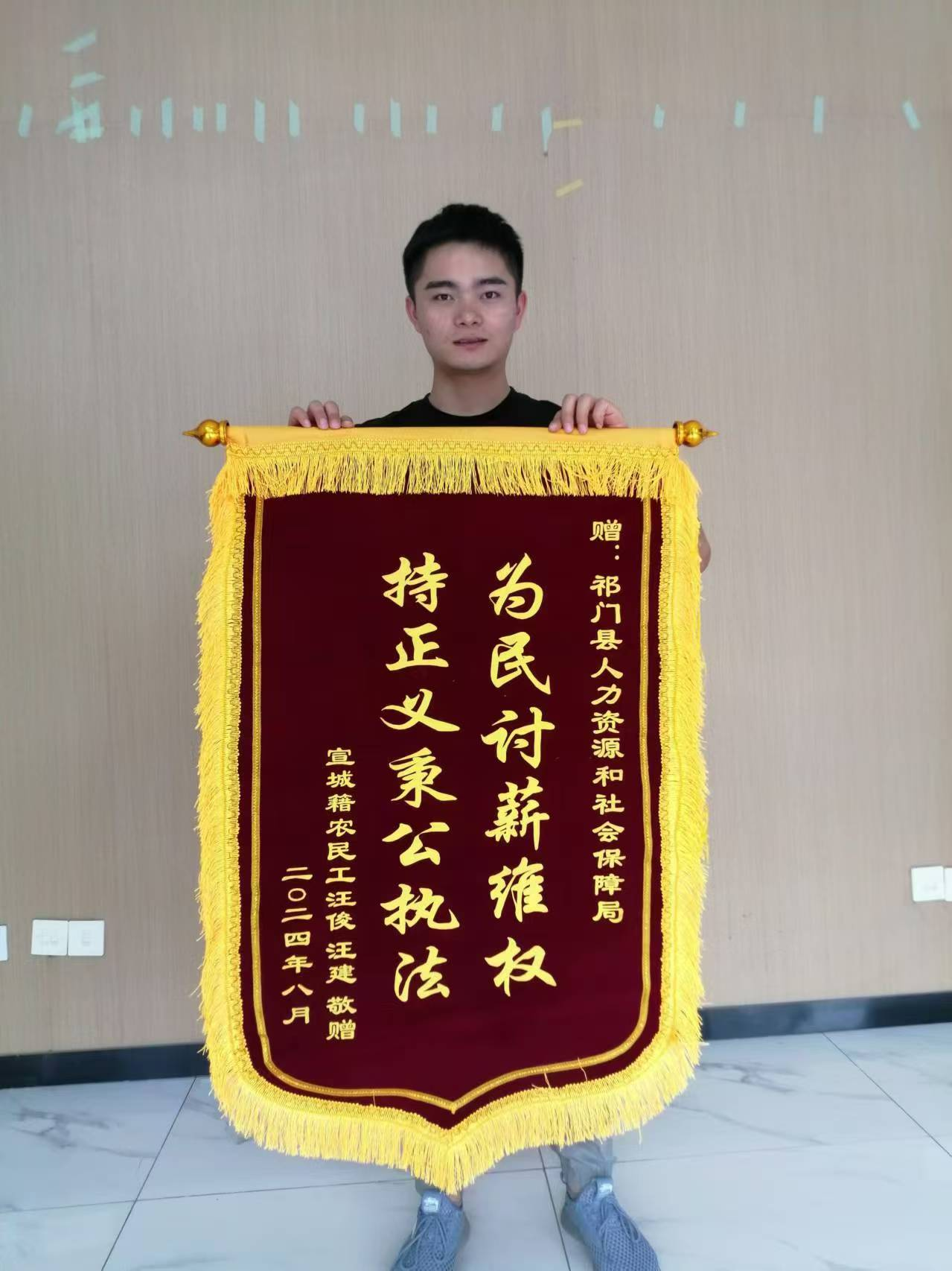 “由于我在外地,到祁门县投诉又不方便,我是抱着试试看的态度,拨打了祁门县人社局的投诉电话,没想到这么快为我们追讨拖欠一年之久的工资,所以我特制作一面锦旗感谢祁门县人社局的同志”,汪俊在电话和祁门县人社局的监察员说。