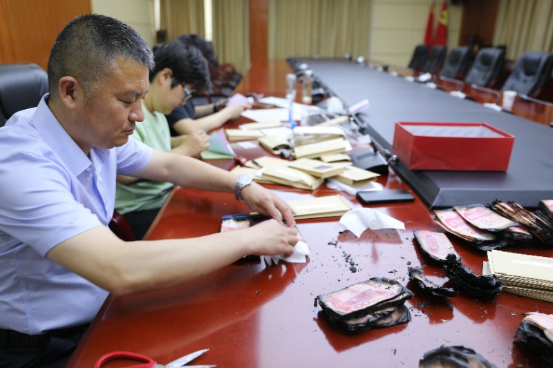 “稍一用力纸币就成碎末,必须软化剥离。”人行货币金银科专家介绍。面对剩余碳化严重、粘连成块的残损纸币,人行亳州市分行与农行亳州分行7名工作人员,兵分两路开展攻坚:一组对分散残币进行手工剥离、逐张鉴别、分类封装;另一组针对板结粘连的碳化币进行完整性鉴定,经过连续数小时奋战,最终成功清点兑换残币约79万元,兑换率超80%,最大限度挽回了客户损失。
